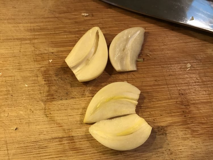 Buying fresh garlic this time of year usually means it will have a root starting inside. If you halve the garlic and see a green shoot, be sure to remove it or your whole dish will be bitter: