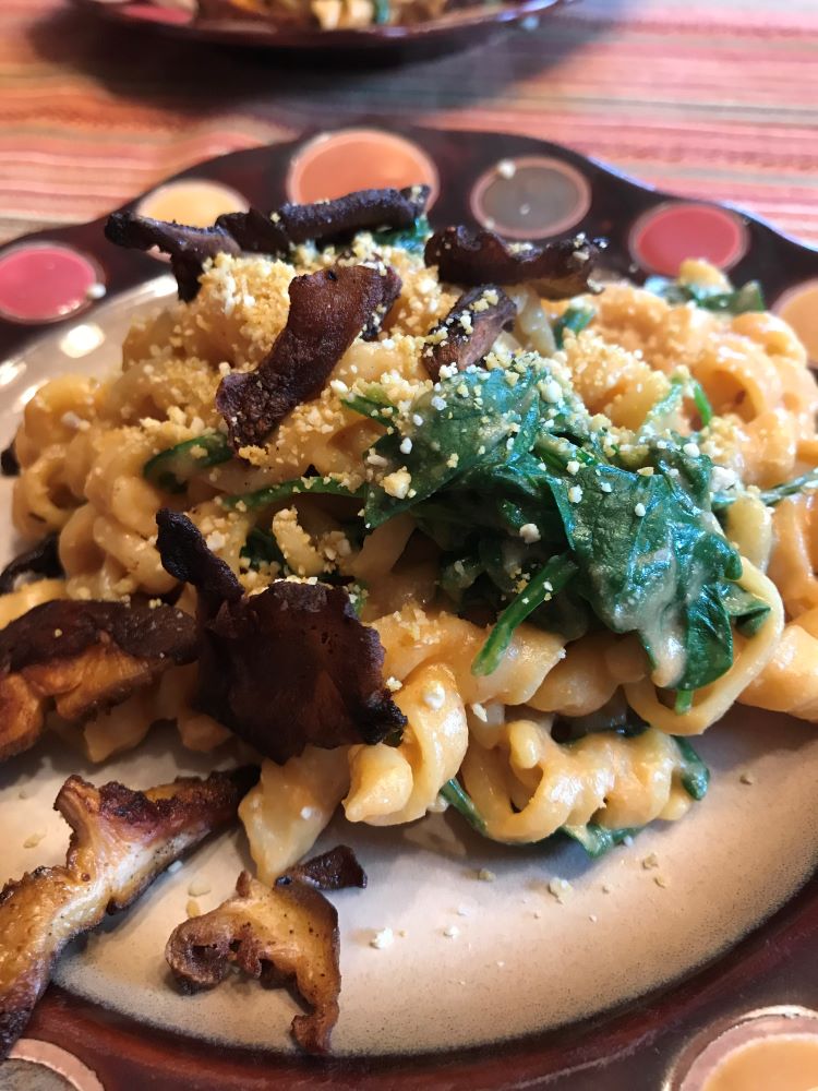 Vegan Mac and Cheese topped with Smoky, Crispy Shiitakes